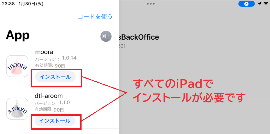 次に、1/31(水)から使用する、本番用moora・aroomアプリは、TestFlightから新たに「インストール」する必要があります。