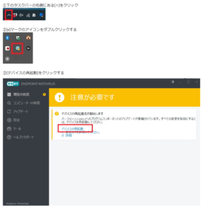 パソコンの画面にESET(ウイルス対策ソフト)で再起動を促すメッセージが出ている方は、ESET画面から再起動をおこなってください。